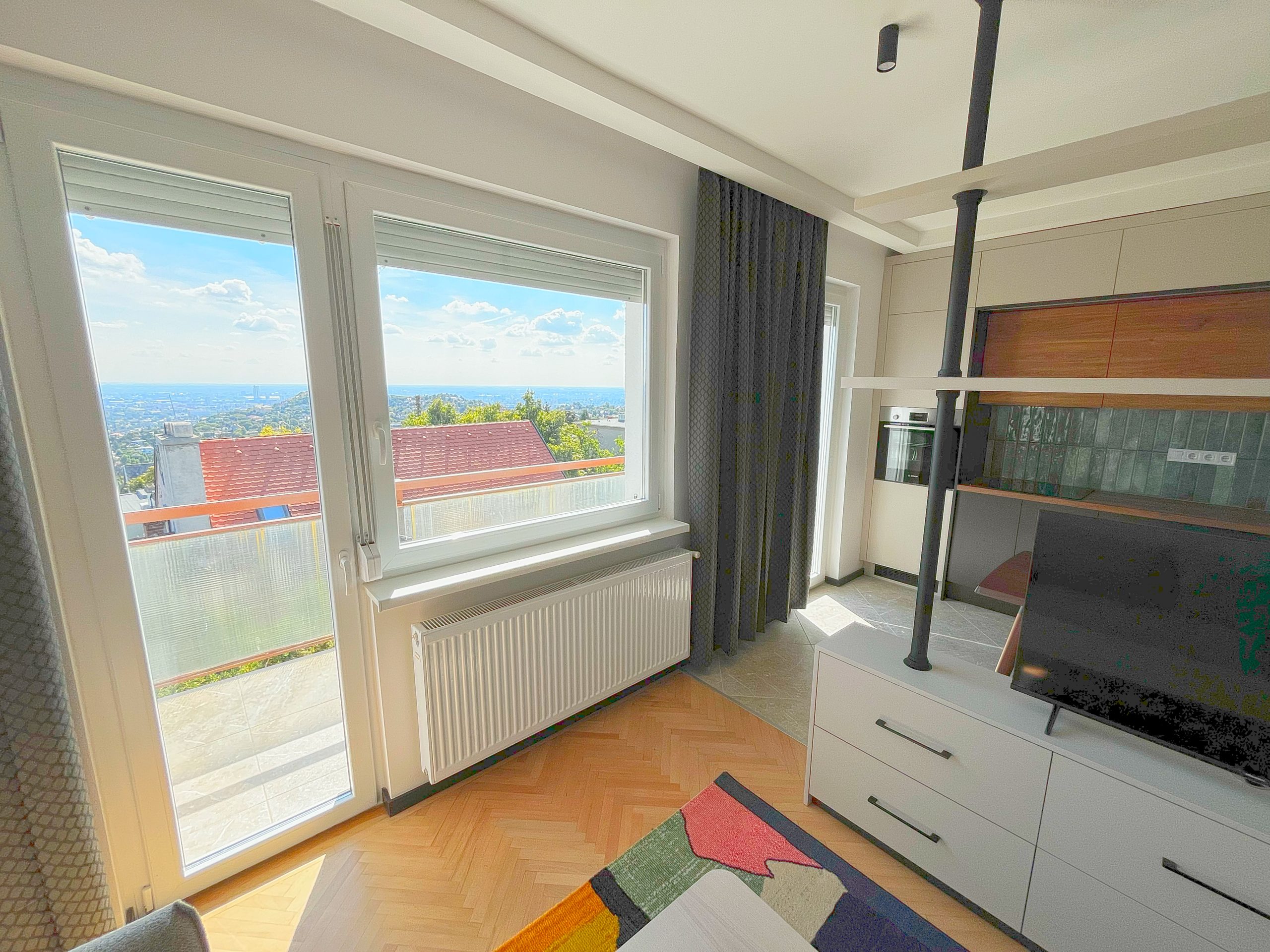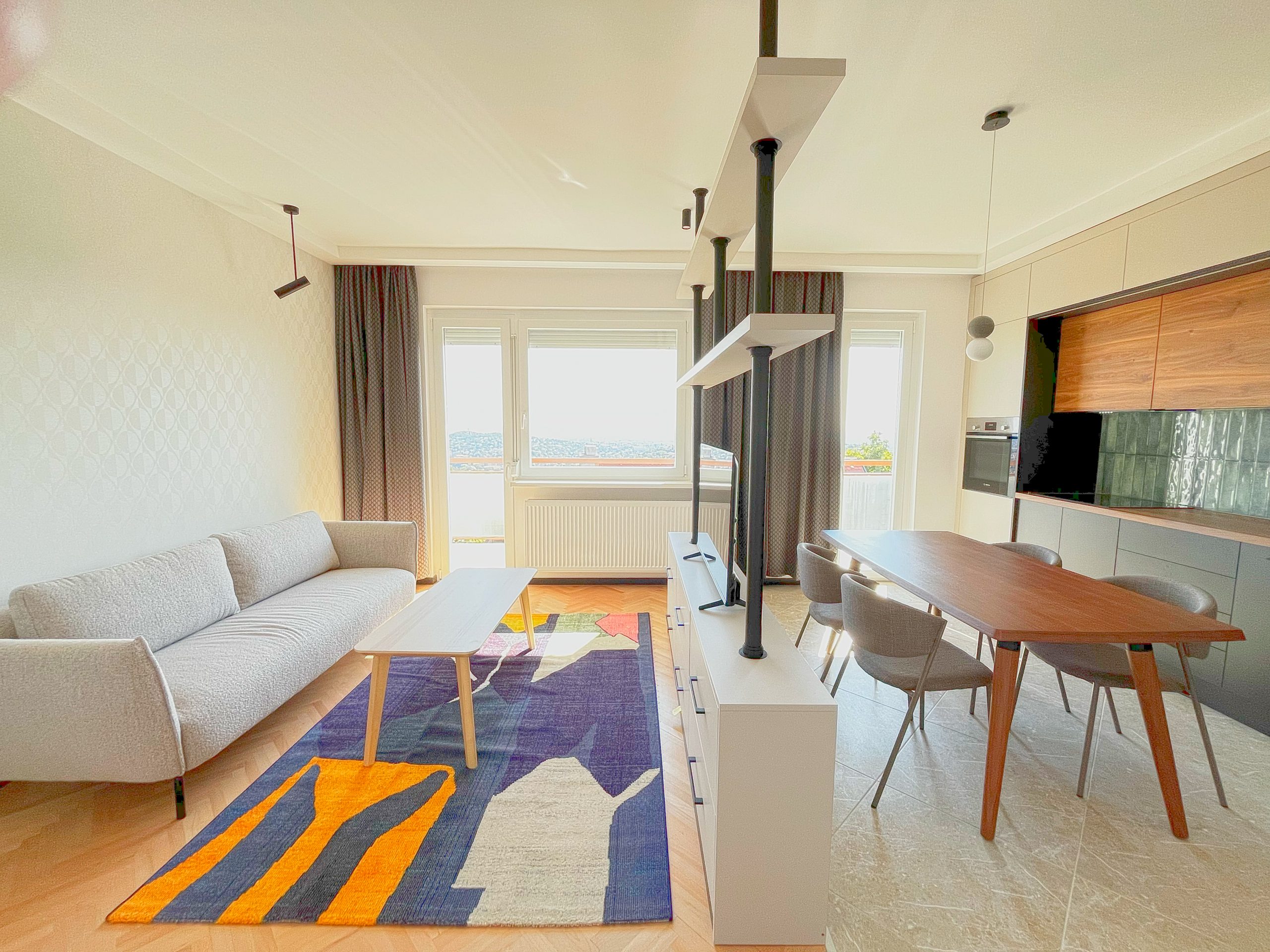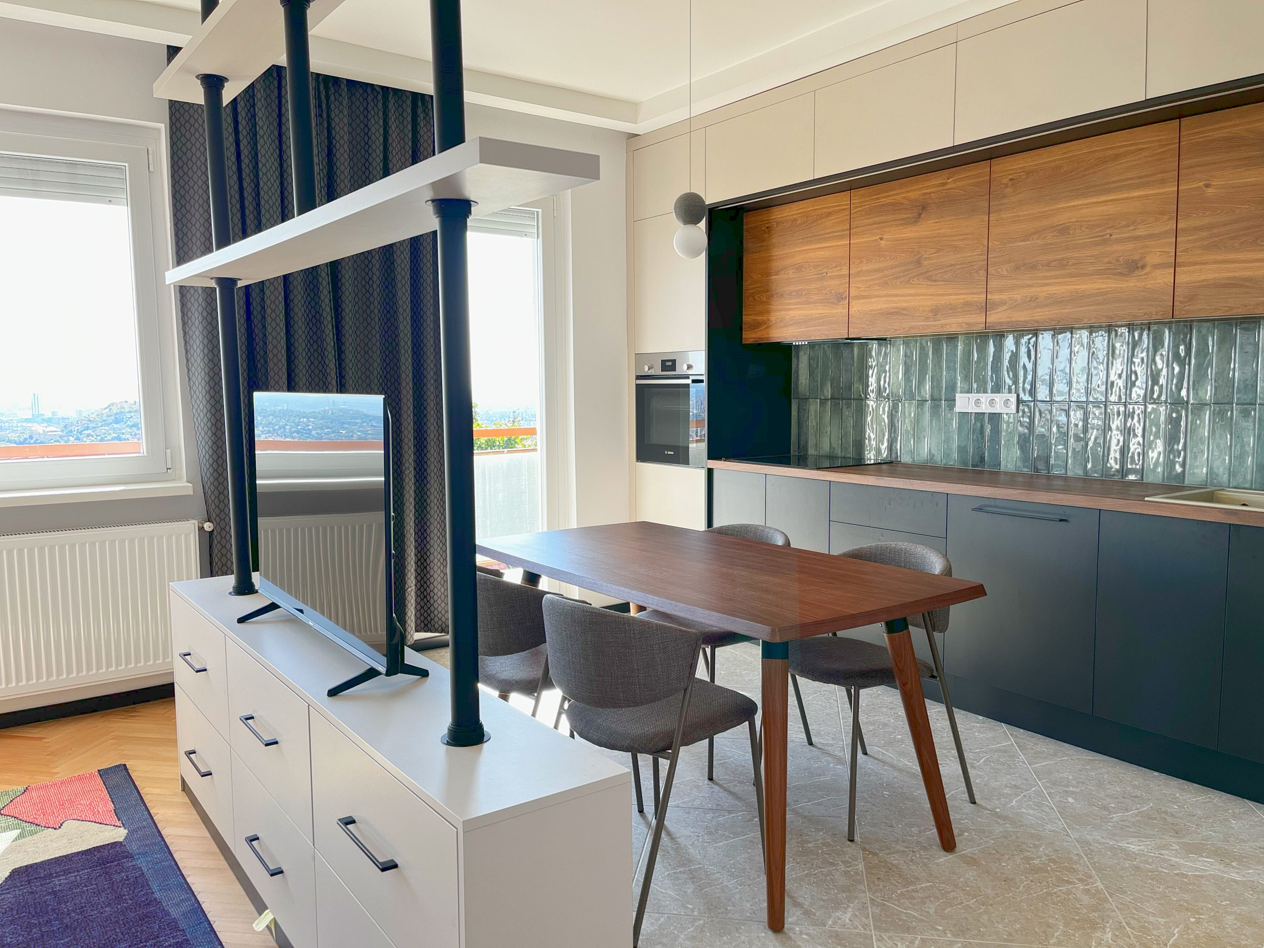 Modern kéthálószobás lakás kivételes panorámával a XII. kerületben. A terek újraszervezése, átalakítása és bútorozás után ilyen lett a végeredmény.